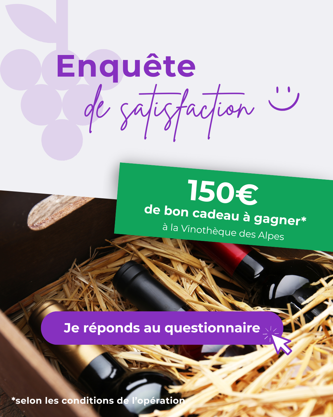 Dans le cadre du Jeu, une dotation sera mise en jeu pour l’ensemble des participations à l’enquête de satisfaction « 1 bon cadeau à la Vinothèque des Alpes d’une valeur commerciale de 150€ TTC ».